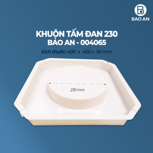 Khuôn tấm đan 230 Bảo An là sản phẩm khuôn nhựa kỹ thuật cao cấp, được thiết kế bởi Bảo An với mã số 004065. Khuôn có dạng hình vuông tiêu chuẩn 400 x 400mm, phần lỗ tròn đường kính 230mm ở giữa, phù hợp để đúc các tấm bê tông đan dùng trong hạ tầng giao thông, bờ kè và các công trình dân dụng.